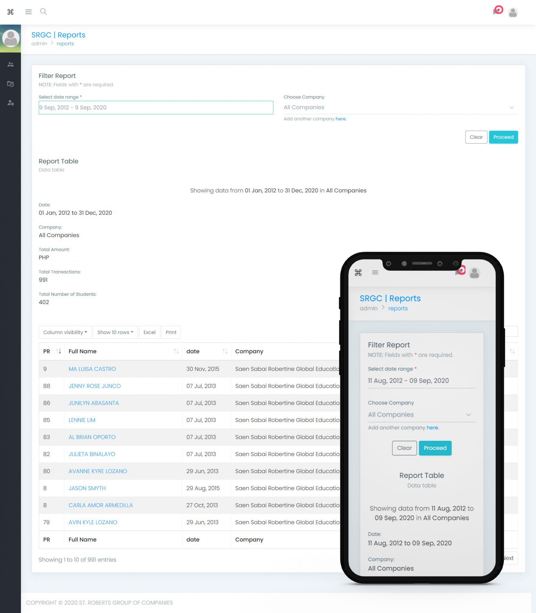 Using datatables API and moment.js, they can easily sort the data according to the date and the company. It is fully responsive.